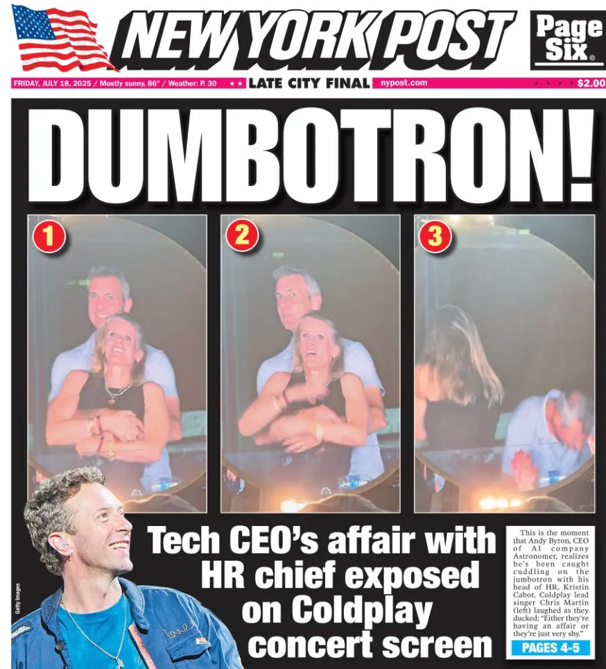 Like millions of people across the country, and some untold number around the world, I laughed when I saw the video of Astronomer CEO Andy Byron and the company’s chief “people officer” (aka, its head of Human Resources) Kristin Cabot get caught embracing on camera at a Coldplay concert last week. But of course it wasn’t the embrace that caused the video to go viral. It was the fact that in the clip the couple quickly realize their images are being projected onto jumbotron screens around the stadium and scramble in a panic to disappear. Byron ducked and vanished to the bottom right of the frame, while Cabot simply turned her back and waited it out until the camera moved on.